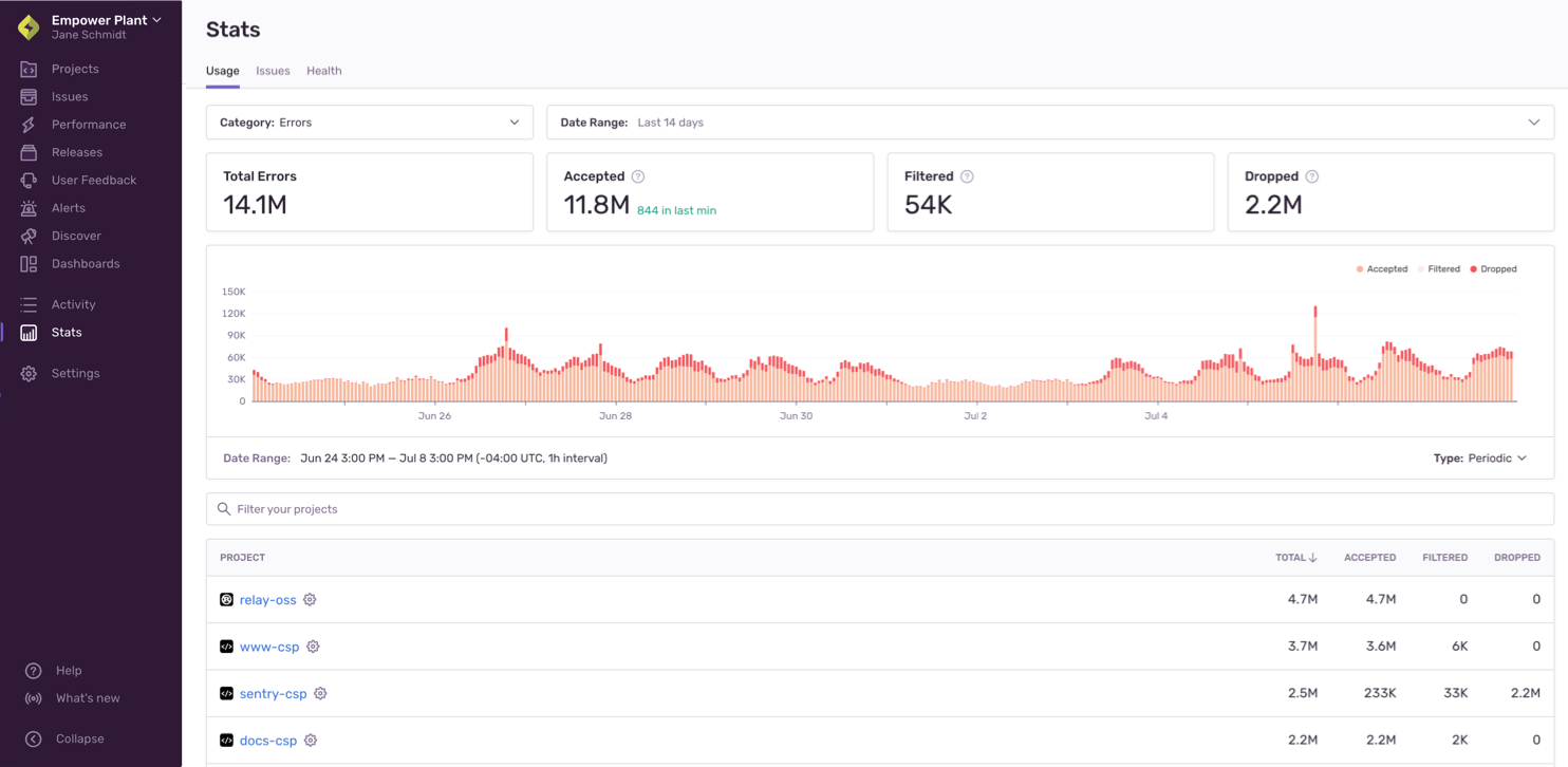 To see which projects are using up your quota, you can review the "Usage" tab of Stats. This page can be viewed by any member of your organization. In addition, you can come back to this page to check if the changes you've made are having the desired effect: